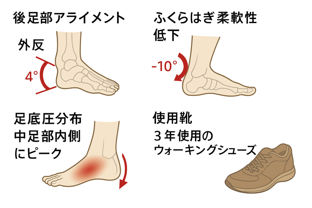 | 後足部アライメント | 外反 4° | 着地で内側にねじれる |